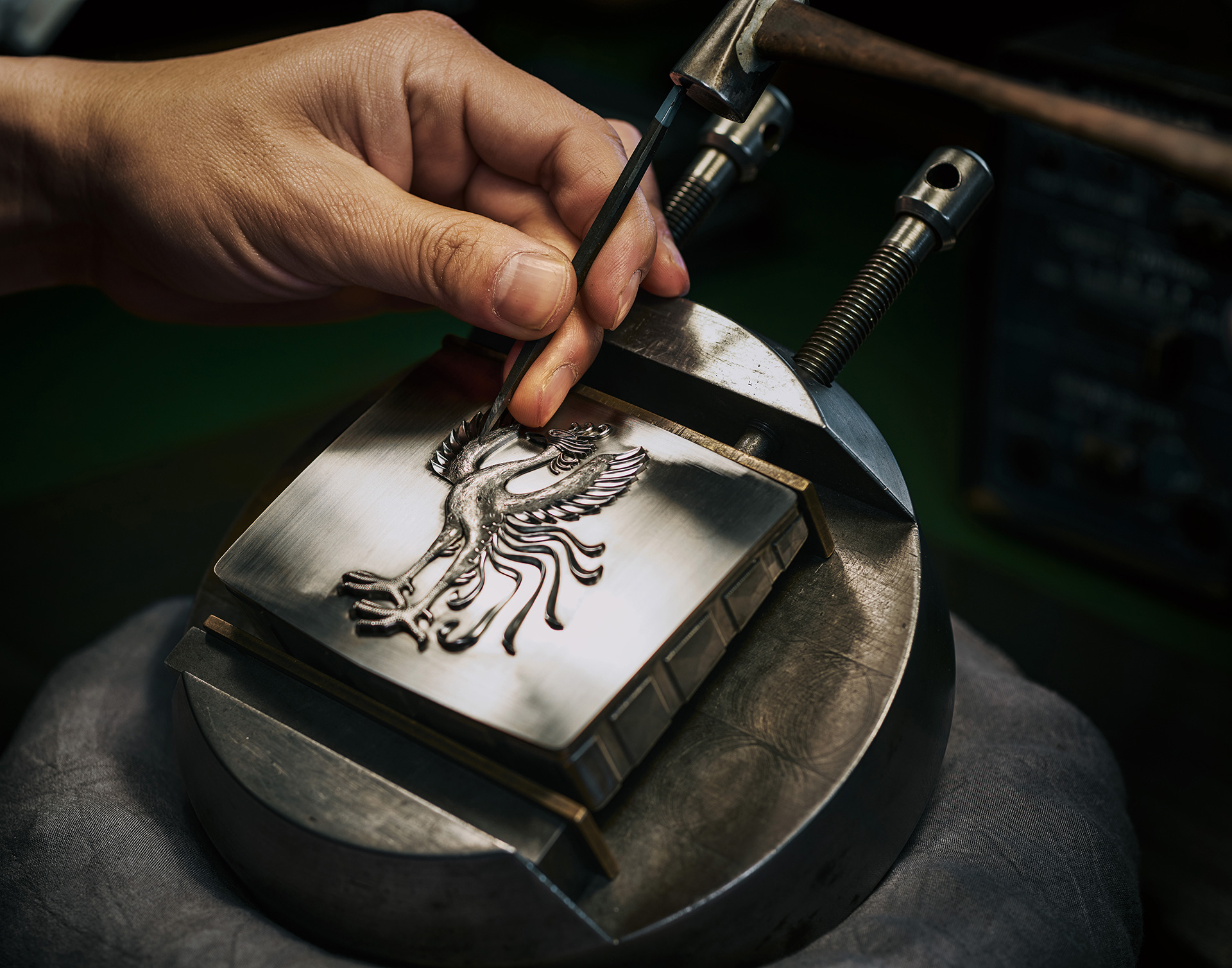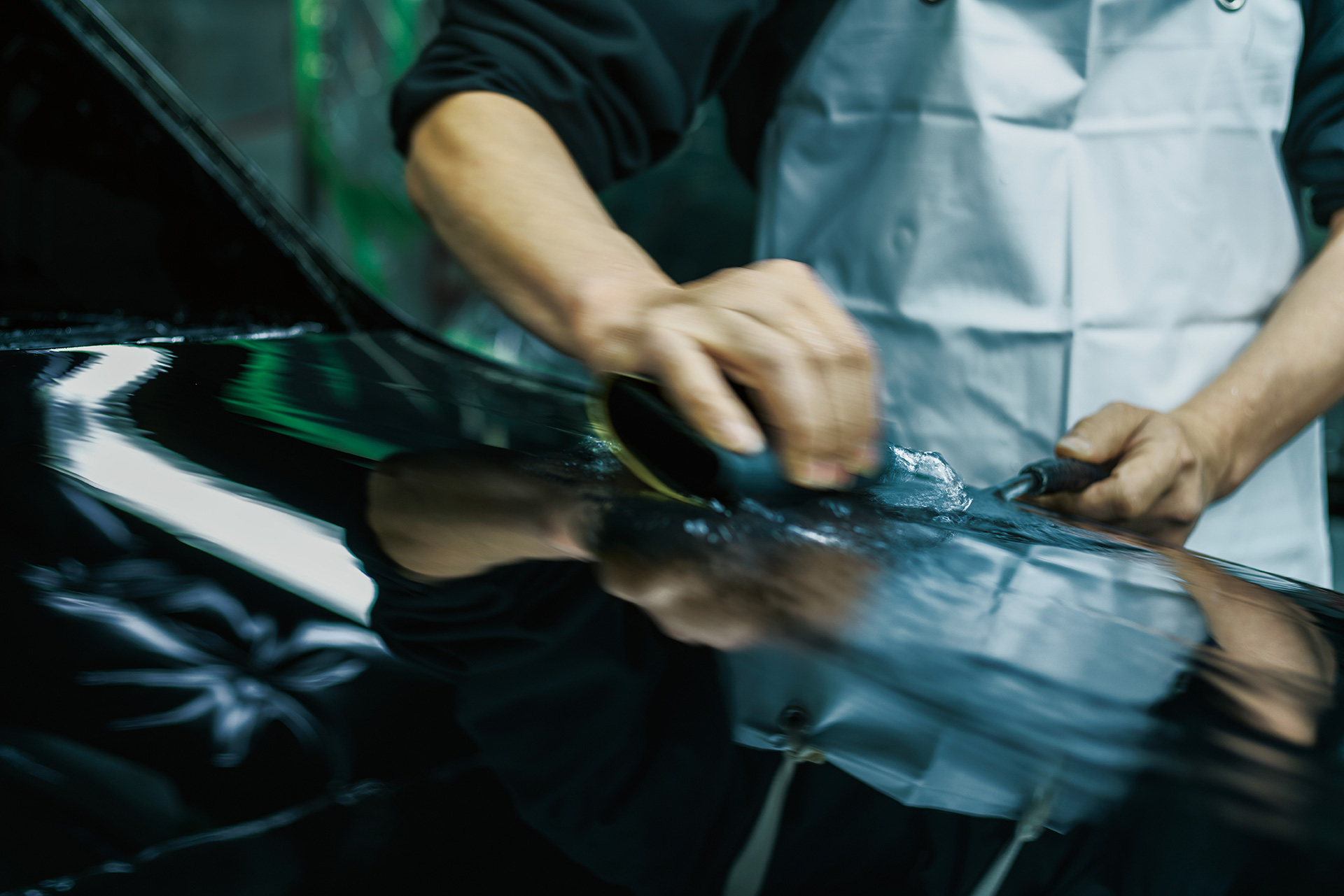 일본 전통 공예에서 사용하는 옷칠을 참고해 흐르는 물에 미세하게 생긴 울퉁불퉁한 표면을 수정하는 '습식 연마(흐르는 물로 작업)' 작업을 세번 실시하고, 그 후 작은 오차도 남지 않도록 '거울 표면 같은 마무리' 작업을 진행한다.