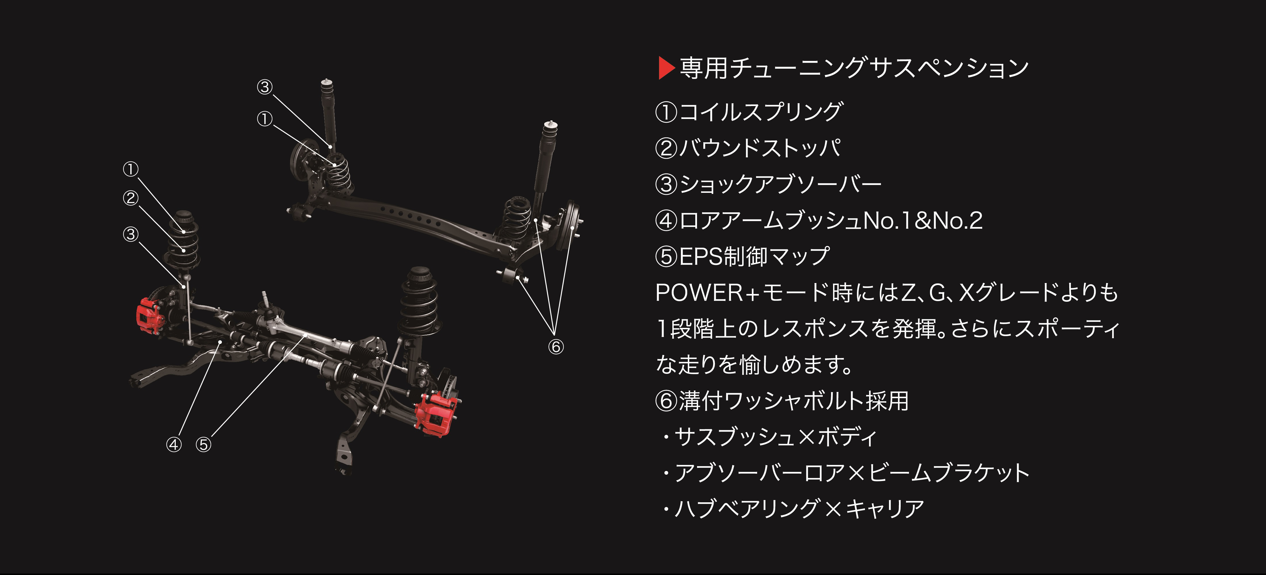 프런트 서스펜션은 업소버 특성 및 코일 스프링을 튜닝하고, 스태빌라이저 특성을 변경했다. 전용 바운드 스토퍼를 더했으며, 로어 암 부싱 특성을 변경해 응답력을 끌어올리고, 적절한 스탠스와 컨트롤 성능을 개선했으며 높은 수준의 승차감을 모두 가능하게 만들었다.