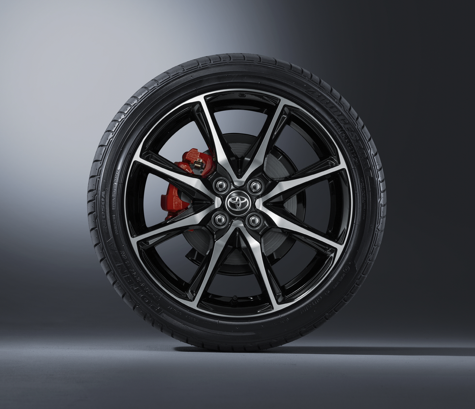 205/45R 17 사이즈의 타이어와 17인치 전용 알루미늄 휠을 장착하고, 포텐자 RE050A 타이어는 그립과 코너링 성능을 고차원으로 구현했다. 또한 프런트 브레이크 캘리퍼에 "GR" 로고가 새겨진 레드 컬러를 더해 스포티한 이미지를 강조했다.