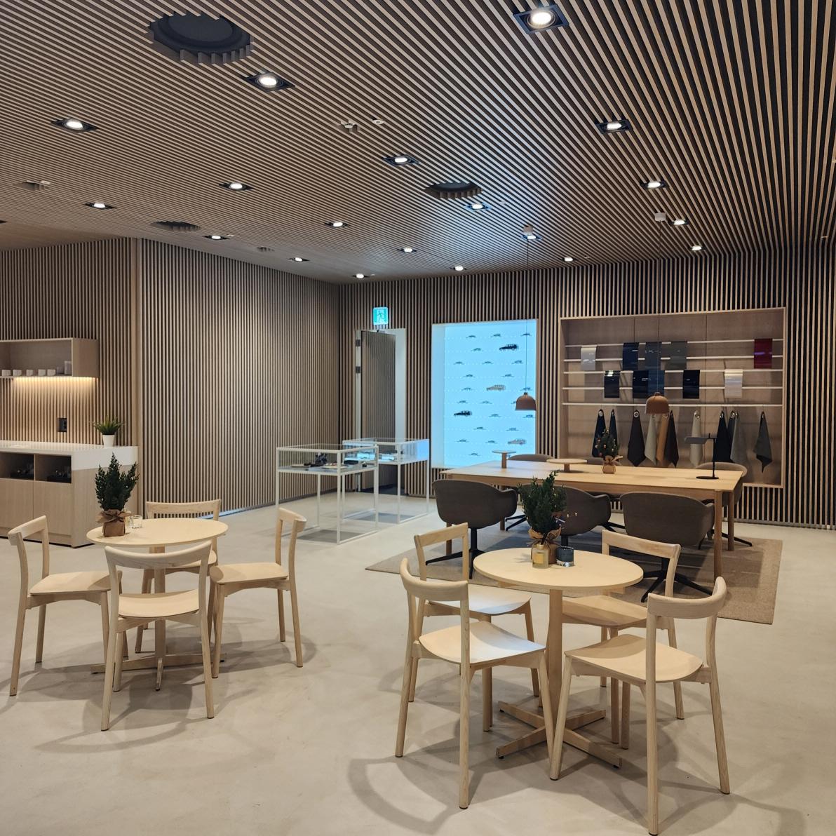 전시장 안으로 조금 더 들어가면 아주 넓은 공간에 영업사원을 만날 수 있는 공간과 작은 카페가 있고, 그 옆으로 또 하나의 거실이 펼쳐집니다.