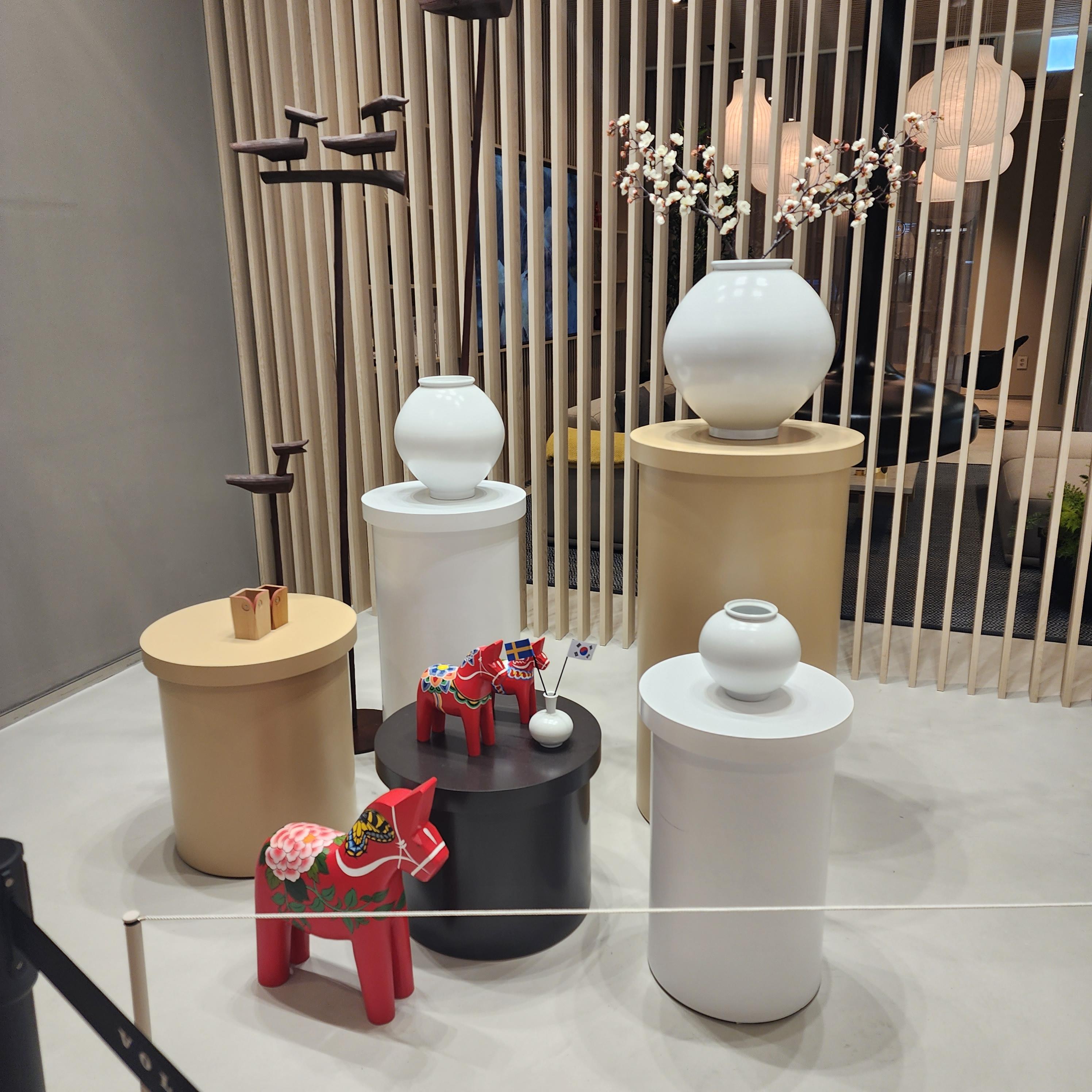 입구에 이런 멋진 공간이 있는데, 볼보는 이곳을 '아트 에어리어'라고 부릅니다. 자세히 보면 재미있습니다. 눈치 채셨나요? 볼보가 한국을 사랑하나 봅니다. 달라 호스가 강렬한 레드 컬러로 화려한 꽃무늬를 하고 있습니다. 달라호스가 스웨덴 가정의 필수품인데 가정의 평안과 개인의 행복을 비는 목각인형이고 복을 준다는 의미가 좋습니다. 거기에 500년 전 이야기지만 가정 어디나 있었고 일상에 가장 많이 사용했을 백자가 있고, 스웨덴 국기와 한국 국기가 나란히 걸려있습니다.