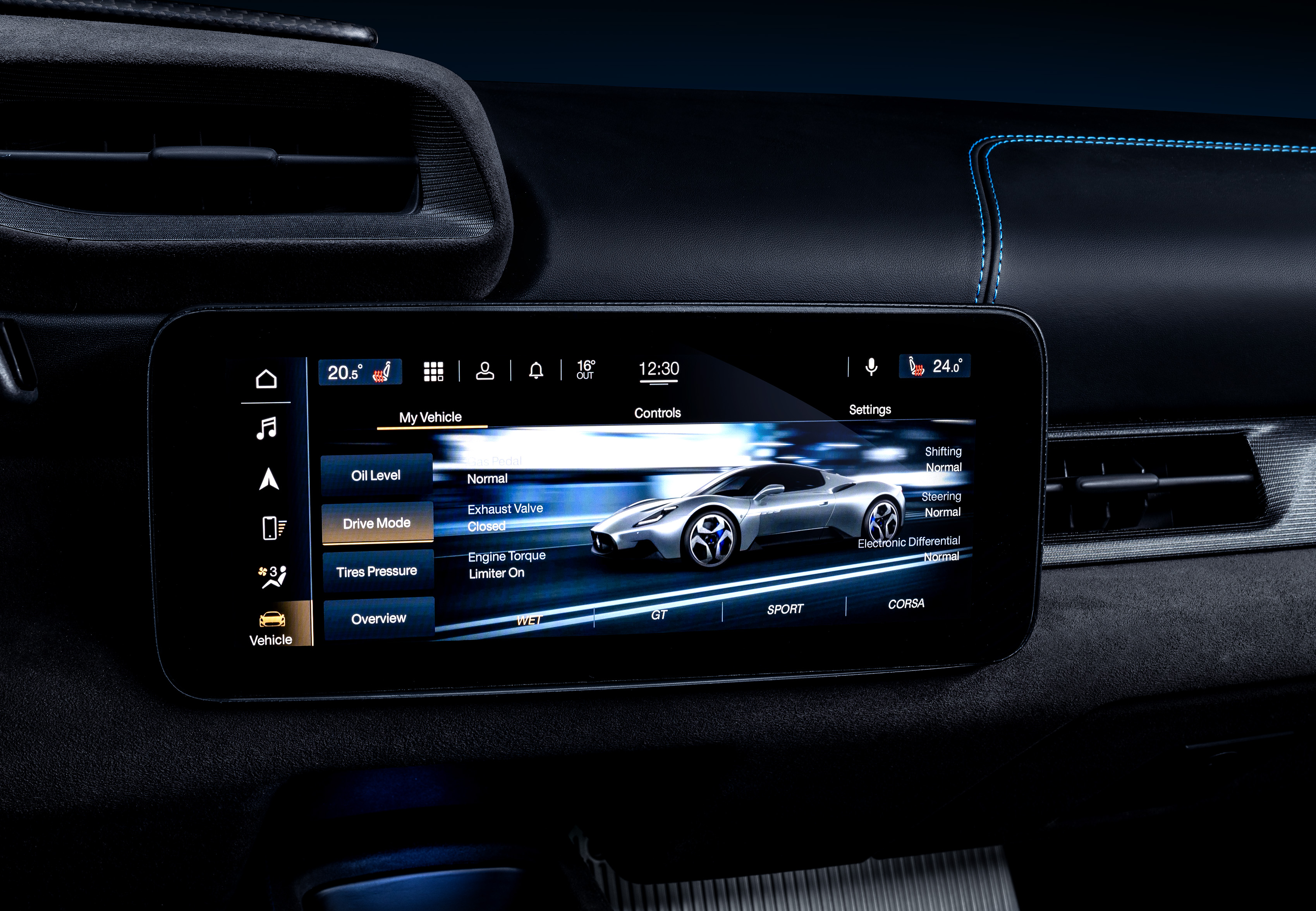 인스트루먼트 패널에는 콕핏과 마세라티 터치 컨트롤 플러스(MTC plus MIA)를 위한 두개의 10인치 스크린이 준비되어 있다. 카본 파이버로 된 센터 콘솔은 아주 심플한 구조로, 스마트폰 무선 충전 패드, 드라이빙 모드 셀렉터(GT, WET, SPORT, CORSA, ESC off), 2개의 스피드 셀렉션 버튼, 윈도우 버튼, 멀티미디어 시스템 컨트롤, 암레스트 수납공간만이 있다. 기타 모든 컨트롤은 스티어링 휠로 가능하며 시동버튼은 스티어링 휠 좌측, 런치컨트롤 버튼은 우측에 배치했다.