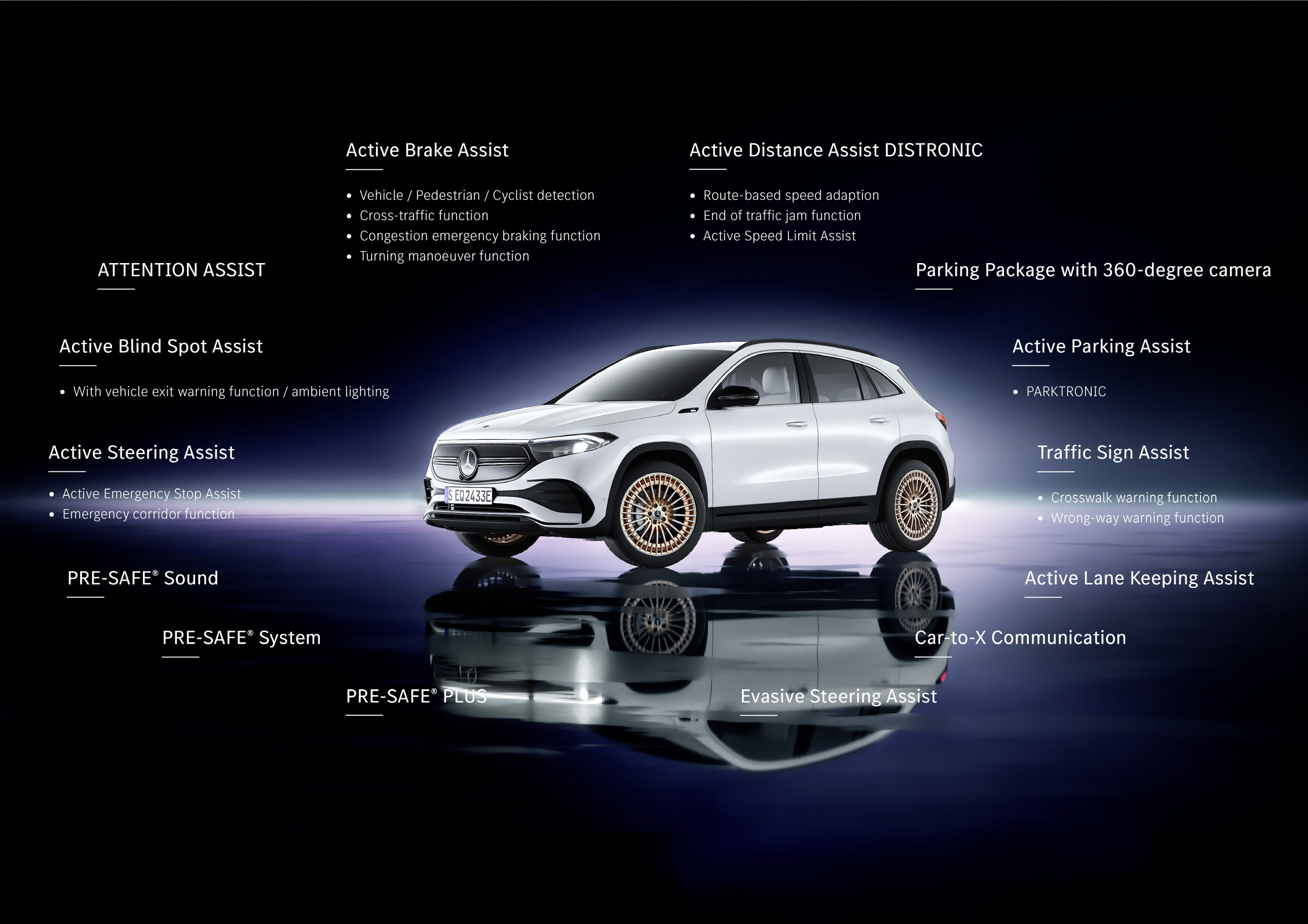EQA 기본 사양에는 어댑티브 하이빔 어시스트가 포함된 LED 고성능 헤드램프, EASY-PACK 전동 테일게이트, 18인치 알로이 휠, 64개 컬러를 선택할 수 있는 앰비언트 라이트, 더블 컵홀더, 4방향 조절식 럼버서포트 럭셔리 시트, 다양한 기능이 추가된 후방카메라, 다기능 스포츠 가죽 스티어링 휠이 포함된다.