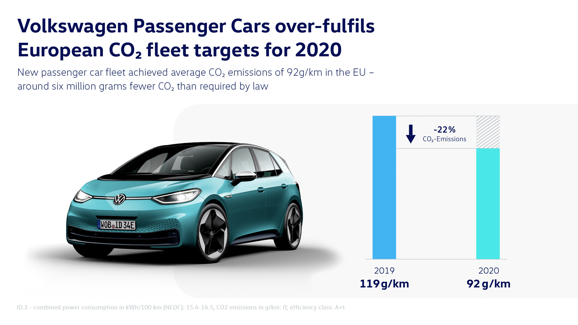 폭스바겐 승용 부문은 예상치로 계산해 볼 때 2020년 유럽 CO2 타겟 목표를 초과해 법에서 정하는 것보다 약 600만 그램 적게 CO2를 배출했다. 유럽연합의 승용 부문 신차 판매를 통해 평균 92g/km의 이산화탄소 배출량을 달성했으며 폭스바겐의 CO2 배출 목표는 97g/km였다. 그 결과 CO2 배출량은 전년 대비 22% 감소했다.