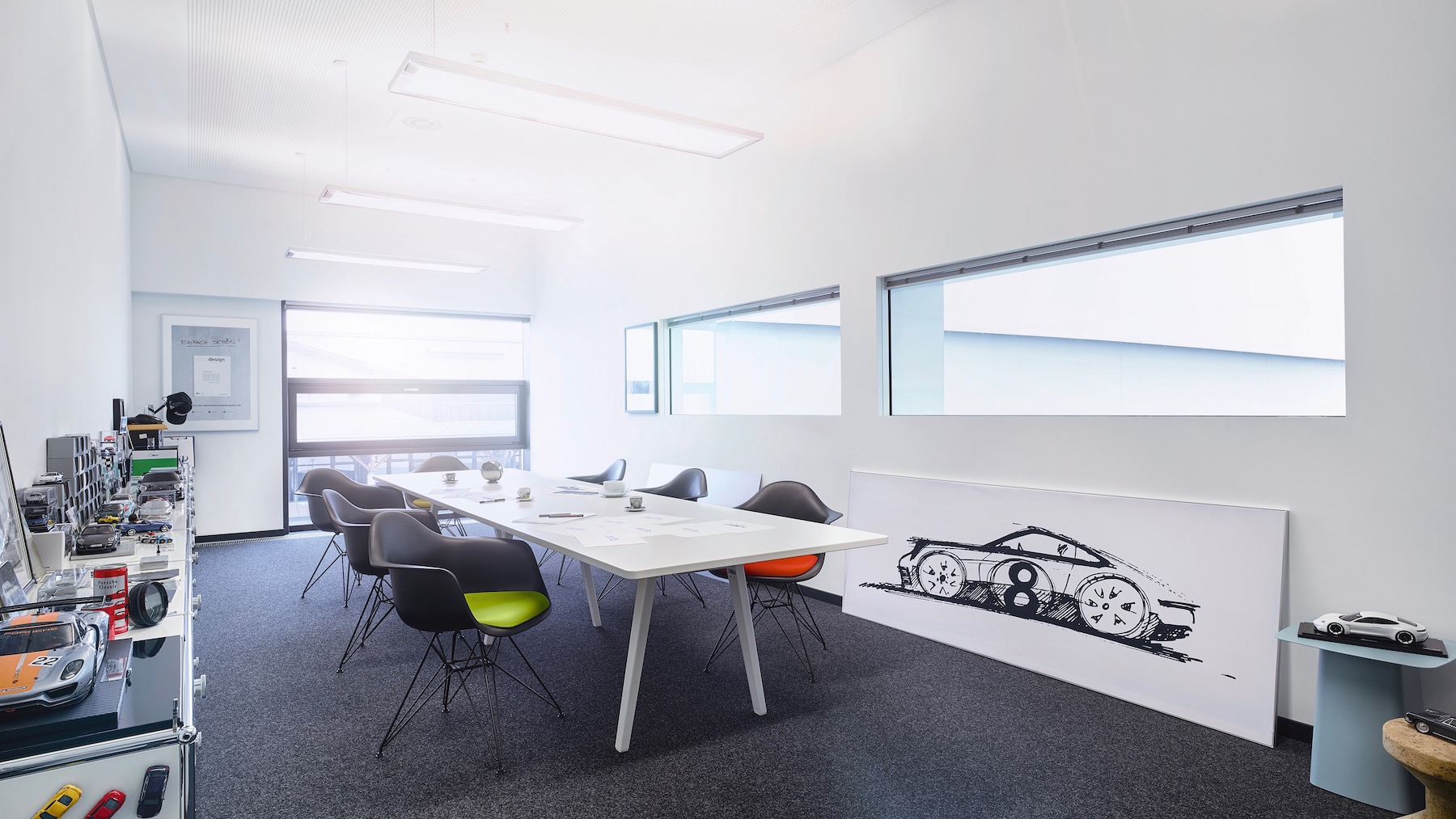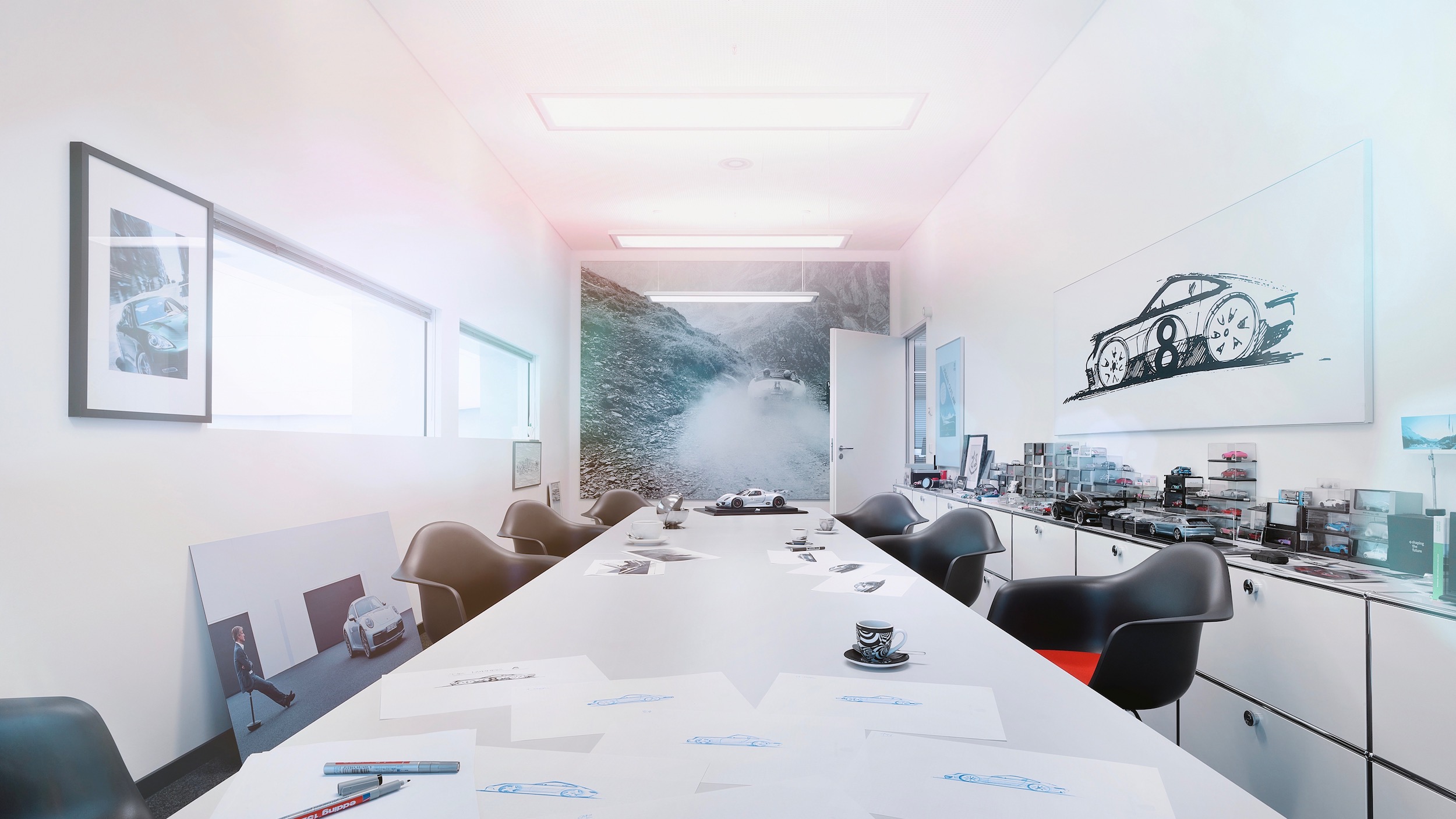 포르쉐의 디자이너, 모델 제작자, 에어로다이내믹스 전문가들이 모두 한곳에 있다는 것은 커뮤니케이션과 보안성 모두 확보할 수 있다. 단순히 형태만 디자인 스튜디오에서 만들어 내는 것이 아니라 기본적인 길이, 폭 등의 수치에서 시트의 미세한 디테일에 이르기까지 인테리어 디자인의 범위는 무한정이다.
