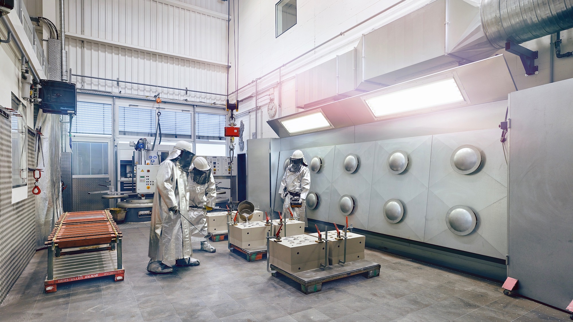 700 °C 이상의 온도에서 용해된 금속은 모래 주조틀에 주입되며, 이 틀은 포르쉐 모델 공장에서 개발 및 제조된 공구를 사용해 생산한다. 가끔 전기모터를 위한 세탁기 드럼통 사이즈의 하우징도 있고, 또 주조 마스터와 그의 팀이 복구한 세공을 위한 부품들도 포함되어 있다.