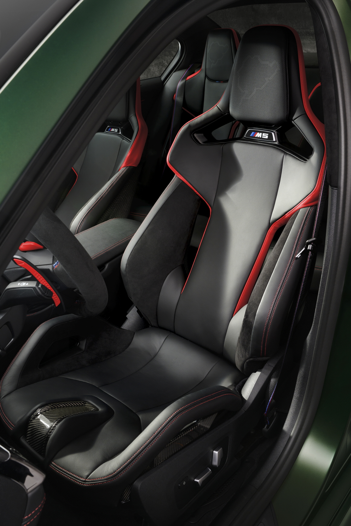 BMW M5 CS에 탑승하면 4명 모두 탁월하고 특별한 드라이빙을 경험하게 될 것이다. 블랙 메리노 가죽 커버와 눈을 사로잡는 컬러 대비 패널과 뮤겔로 레드 스티칭이 강렬한 인상을 준다. M5 로고가 새겨진 ㅎ 헤드레스트 일체형 프론트 시트에는 전설적인 서킷인 뉘르부르크링의 레이아웃이 그려져 있다.