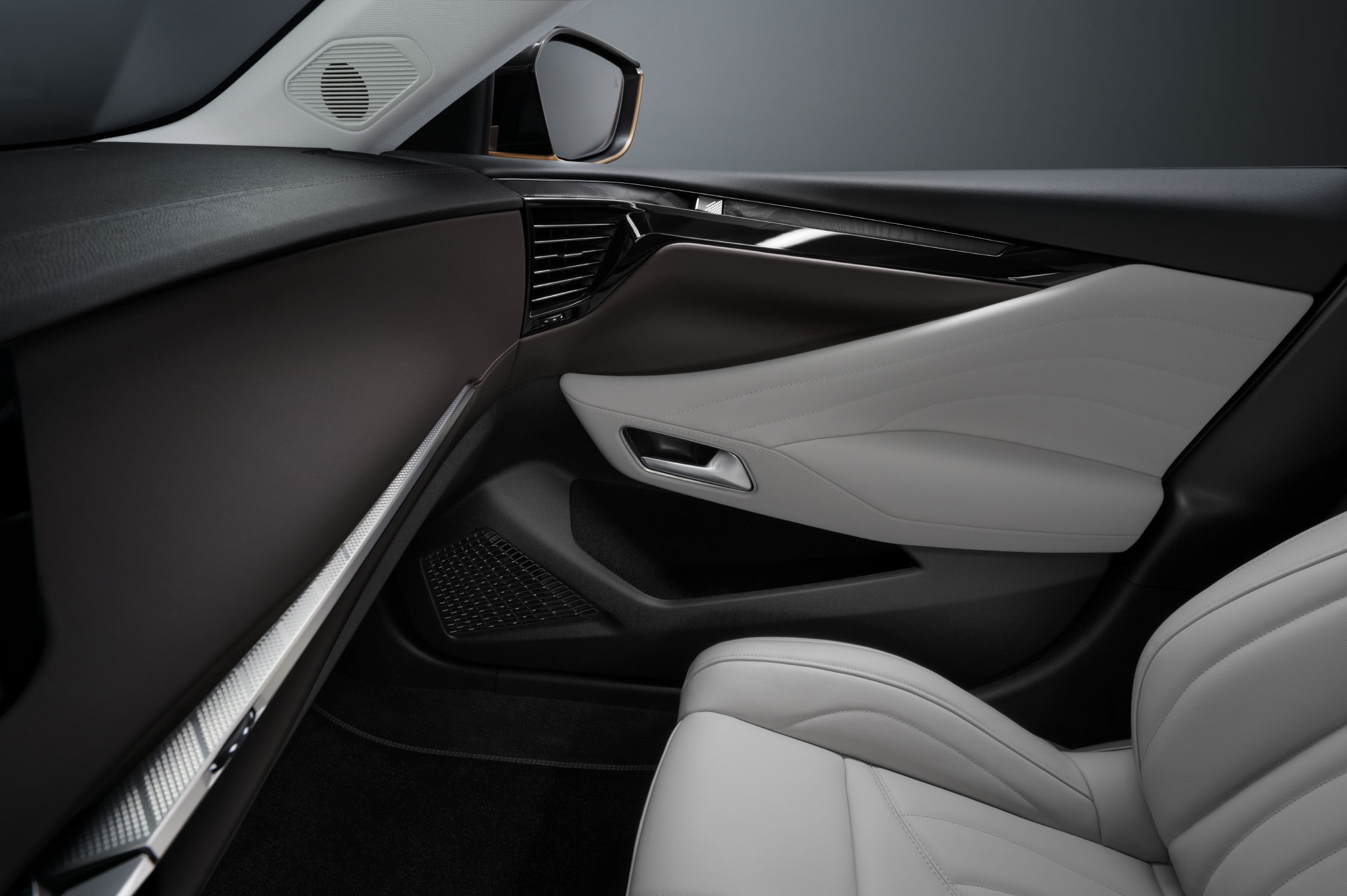 편안함을 주는 공간을 위한 부드러운 터치감이 있는 요소들로 가득한 페블 그레이 그레인 가죽 시트는 그레인 가죽과 끌로 드 파리 기요쉐가 보완하고, 인터랙티브 공간인 상부는 트림이 브라운 애쉬 우드와 고급스러운 크리올로 브라운 나파 가죽으로 구성해 투톤 인테리어를 만들어낸다.