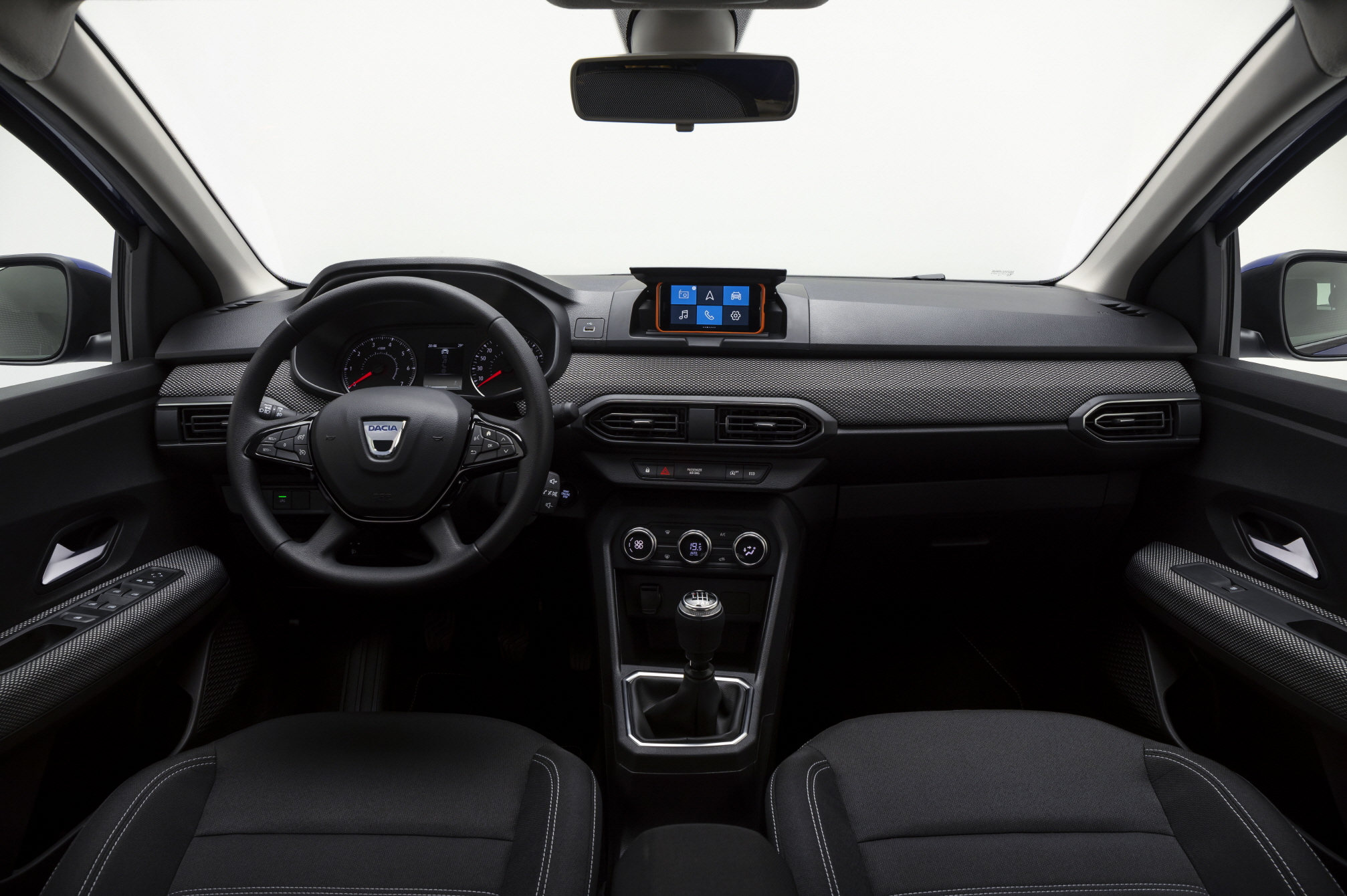 뉴 다치아 산데로의 대시보드 중앙에 있는 슬롯에 들어가는 스마트폰은 완벽하게 고정되며 실제 주행에 완벽하게 도움을 주어야한다. 높은 위치에서 약간 드라이버 방향으로 보고 있는 스마트폰은 운전자에게 자동차의 정보를 완벽하게 전달해 안전한 주행을 돕는다.