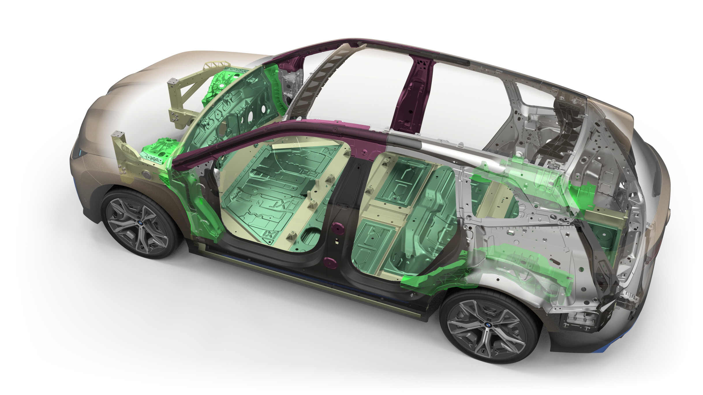 BMW iX의 차체 구조, 디자인 원칙, 섀시 튜닝은 완벽하게 스포티한 핸들링 특성에 편안한 주행을 조합했다. 알루미늄 스페이스 프레임과 루프에 카본파이버 강화플라스틱을 사용한 카본케이지를 사용해 강성을 개선하고 경량화를 지능적으로 이루어냈다.