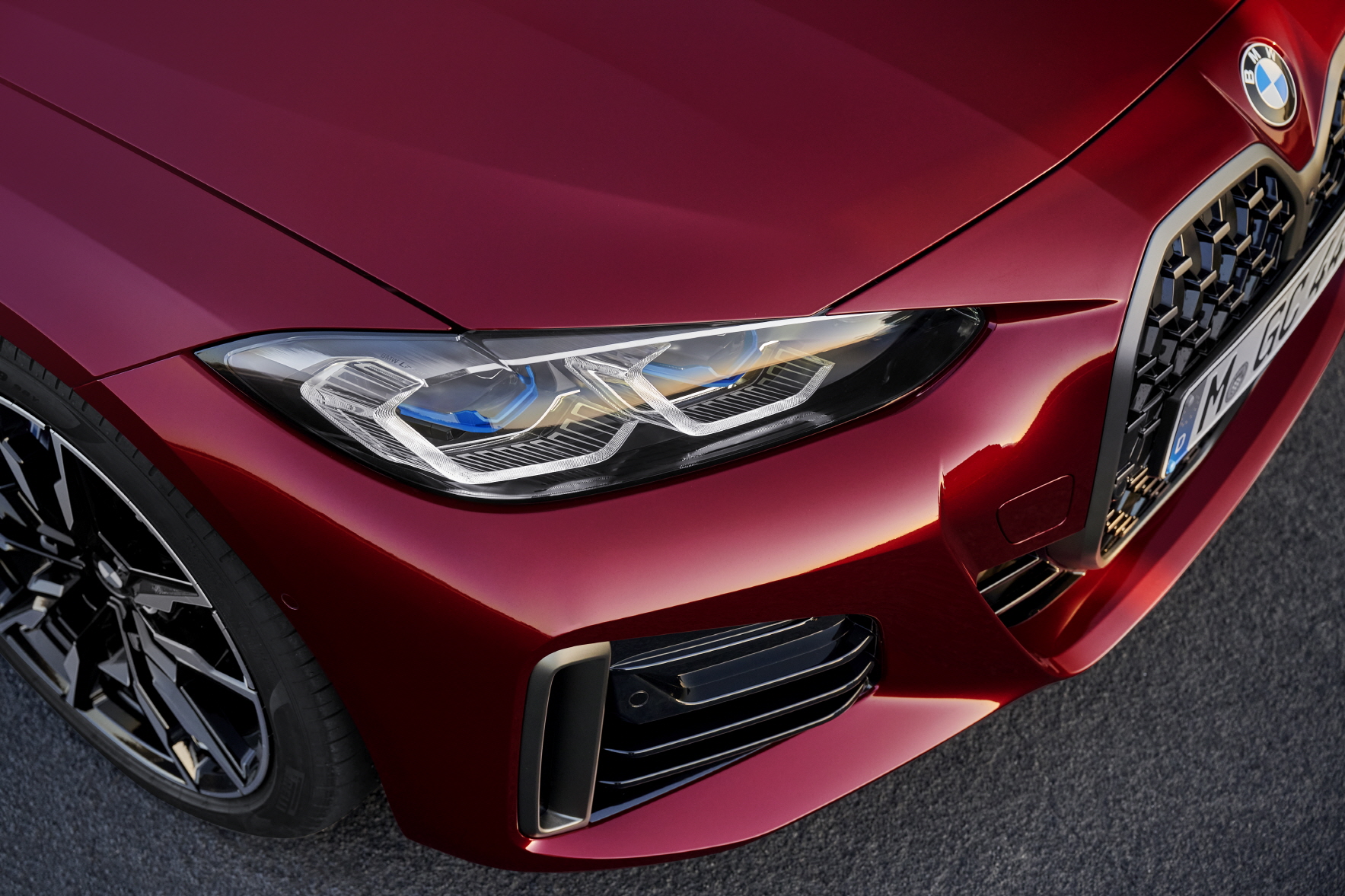 뉴 BMW 4 시리즈 그란 쿠페의 특징이 돋보이는 프론트 엔드는 대담한 라인과 3차원 구조의 표면이 가장 중요한 부분이다. 크고 수직으로 솟아오른 BMW 키드니 그릴이 중심에 위치하고 있어 존재감을 확실하게 뿜어낸다. 슬림한 디자인의 풀 LED 헤드라이트는 주간주행등을 위한 U자형 광섬유 가이드가 장책되어 있다. BMW 셀렉티브 빔 하이 빔 어시스트를 비롯한 BMW 레이저 라이트가 장착된 어댑티브 LED 헤드라이트도 옵션으로 제공된다.