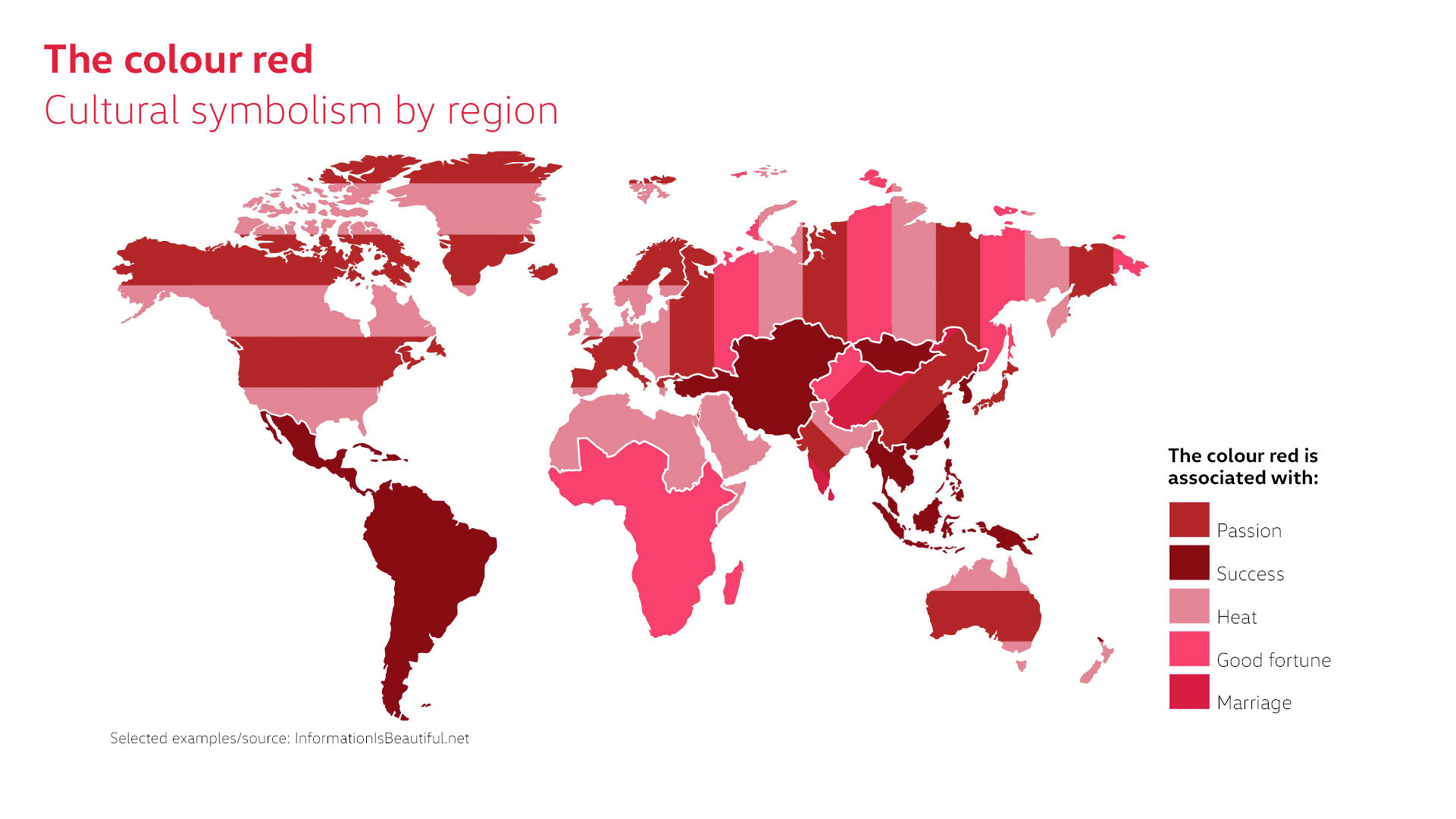 Q. 레드는 문화에 따라 품고 있는 의미가 다르다. 서양 문화에서 레드는 사랑, 용기, 위험, 따뜻함을 의미하며 동유럽에서는 아름다움을 의미한다. 중국에서는 기쁨과 성공을 상징한다. 그리고 남아메리카에서 레드는 정열의 컬러를 의미하고 전 세계가 이에 공감하고 있다. 컬러의 지역적 상징성이 어떤 역할을 하고 있나?