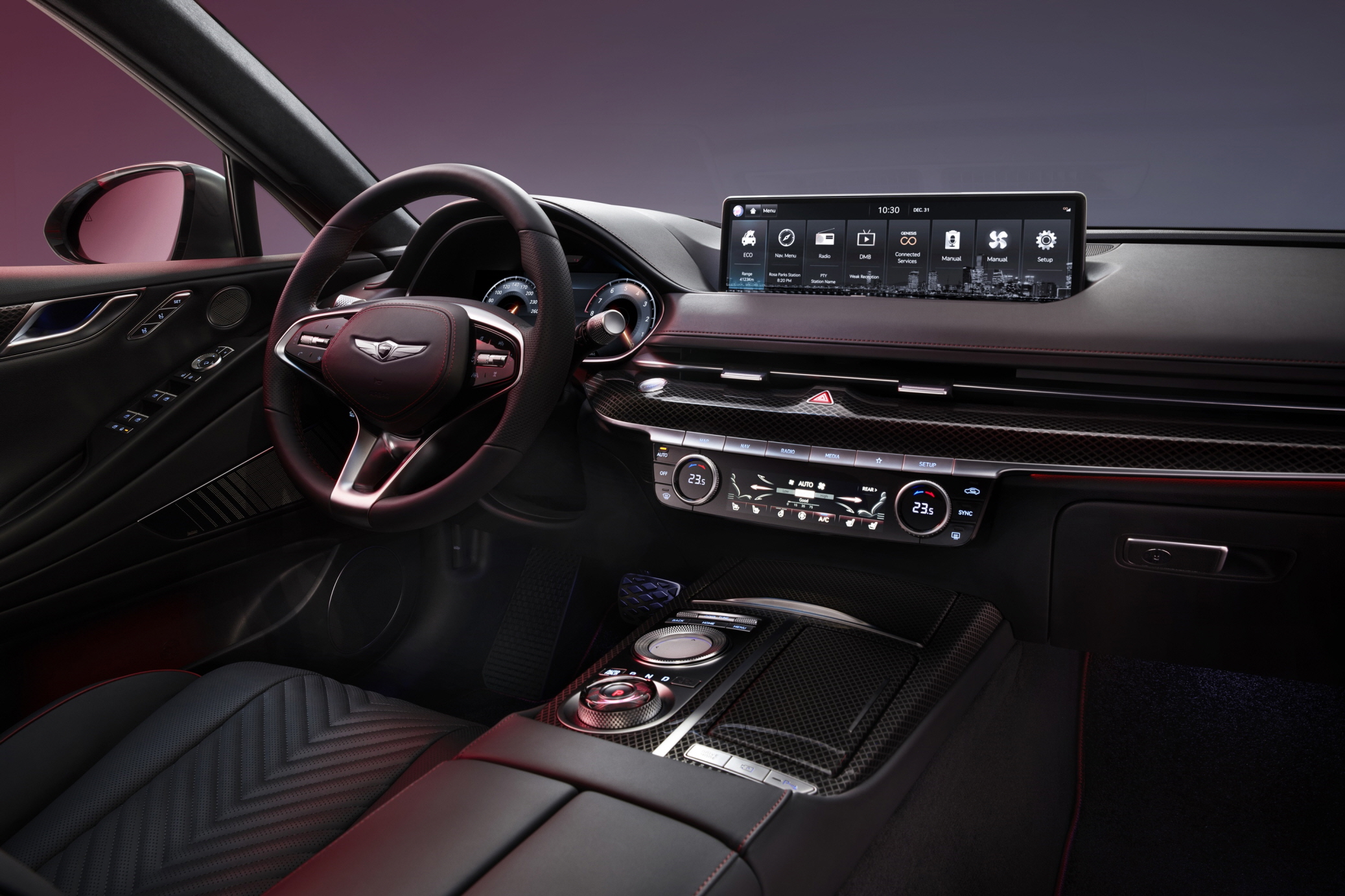 실내엔 G80 스포츠 패키지 전용 ▲3스포크 스티어링 휠 ▲ 하이브리드 위빙/리얼 카본 가니쉬 ▲메탈 소재 페달을 새롭게 적용했다. 이와 함께 G80 스포츠 패키지에서만 선택 가능한 전용 내장 색상 옵시디언 블랙/세비야 레드 투톤을 추가해 스포티함을 더했다.