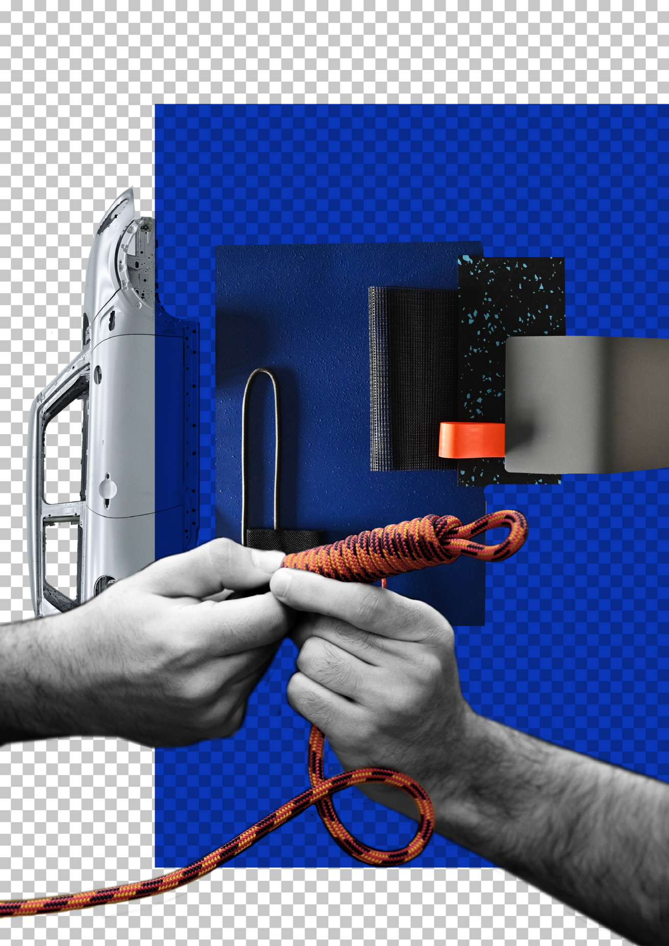 도어 숄더의 핸들은 등산용 로프로 만들었고 그에 맞는 안전 벨트와 함께 밝은 오렌지 컬러로 마감해 실내를 산뜻하게 만들었다. 알루미늄으로 된 도어 핸들은 코르크 도어 숄더에 통합되었고 도어 주변을 고급스