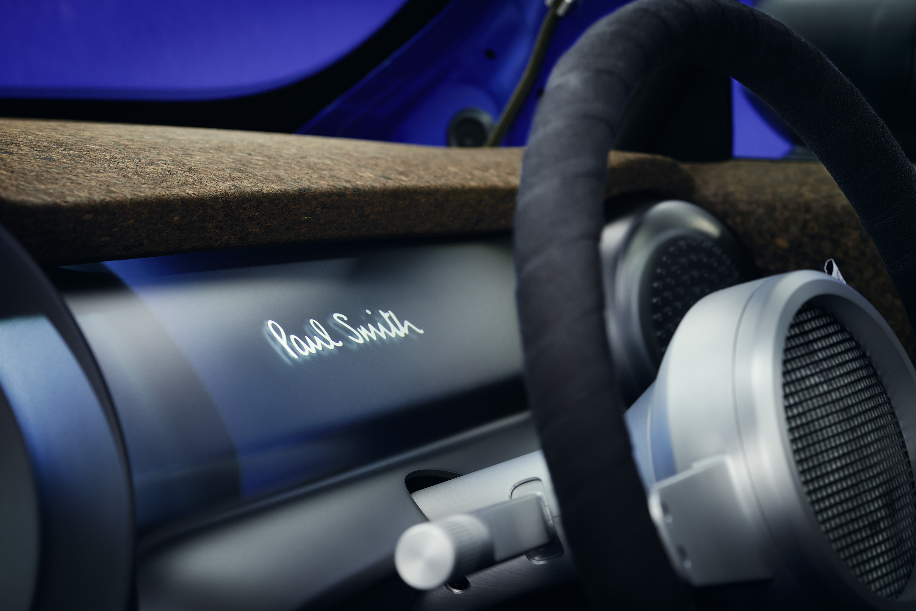 외부와 마찬가지로 스티어링 휠을 분해하고 알루미늄을 재사용하는 것이 얼마나 쉬운지를 보여주는 나사가 하나 있다. 1시 방향에 위치한 작은 직물로 제작한 'Paul Smith' 라벨은 인테리어에서 찾을 수 있는 협업을 알려주는 포인트 중 하나다.