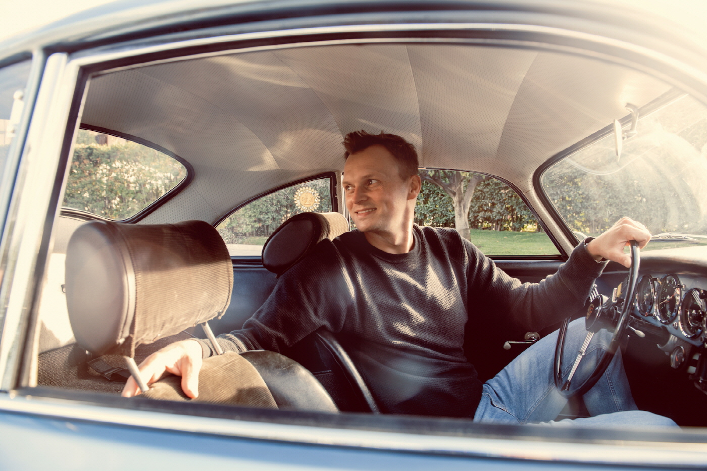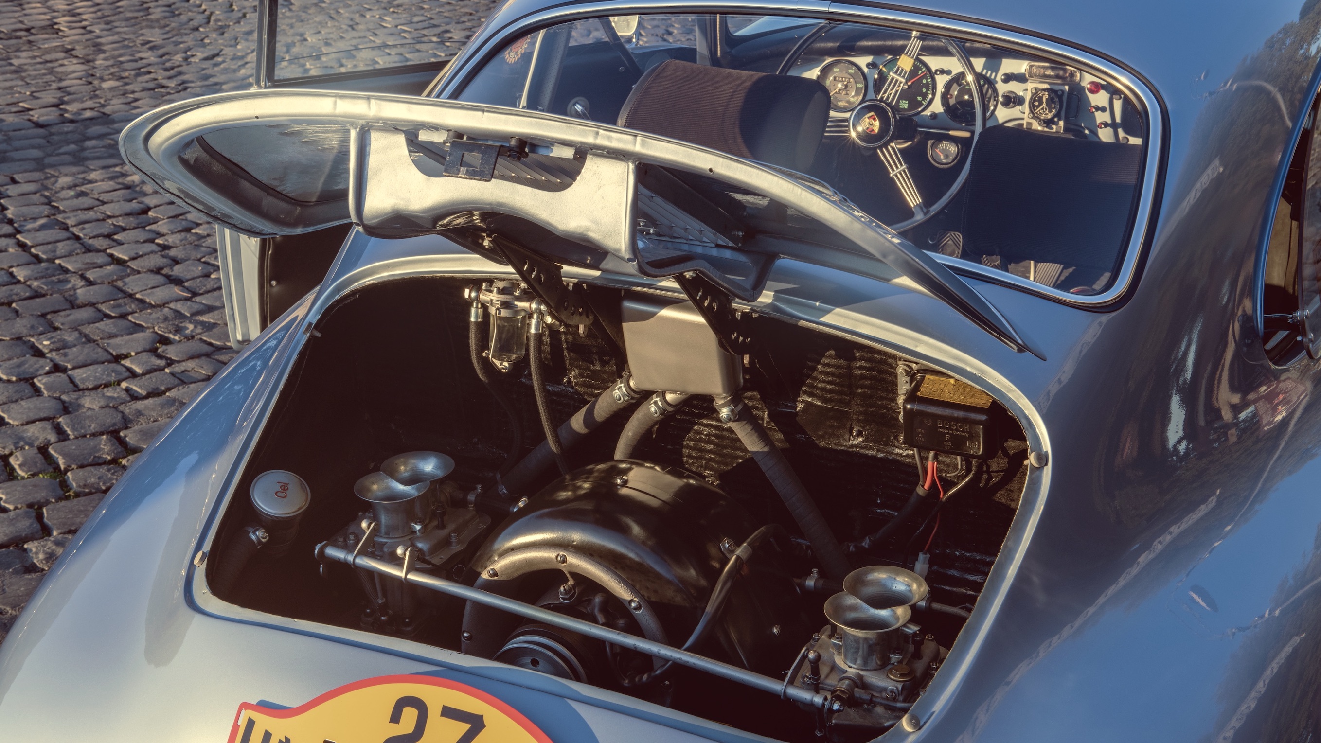 자격을 갖춘 자동차 기술 엔지니어는 사이드미러를 보며 콜로세움을 가리킨다. 356의 대형 스티어링 휠은 린지와 슈트랄레 의해 설치된 특별한 기기가 설치되어 있다. 3,500rpm 표시는 여전히 엔진회전계에 남아 있다.
