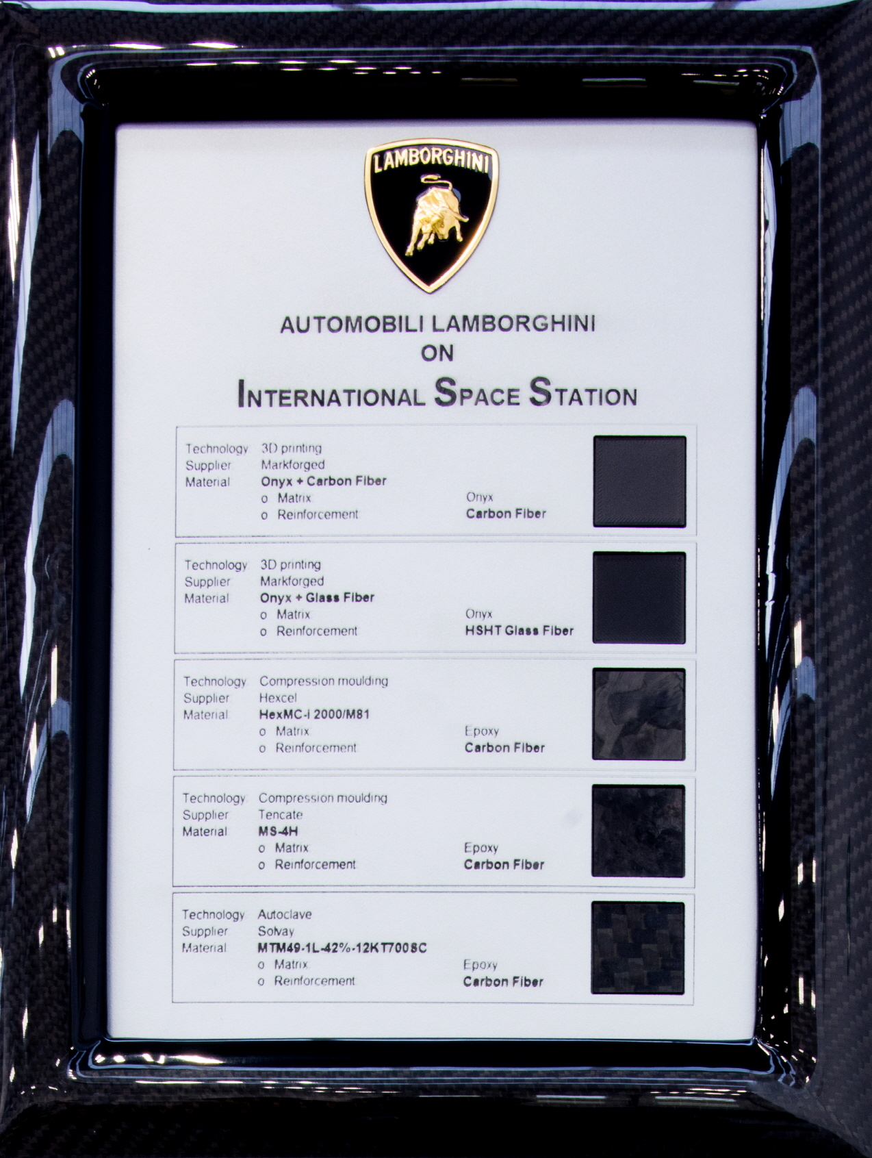 우주에서 실험을 진행했는데, 람보르기니는 국제우주정거장(ISS)에서 카본 파이버 소재에 대한 연구를 수행한 세계 최초의 자동차 제조사가 되었다. 람보르기니와 휴스턴 메소디스트 병원 연구소가 2년 전 시작한 첨단 카본 파이버 복합 소재에 대한 공동 연구는 이제 중요한 이정표를 달성하게 되었다.